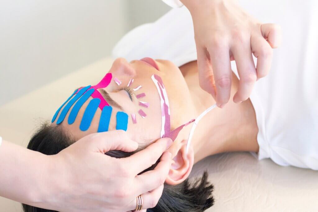 Poprzez odpowiednie przyklejanie plastrów do kinesiotapingu stymulujemy mięśnie skóry. Zazwyczaj przykleja się je wzdłuż przebiegu naczyń limfatycznych i krwionośnych na czole, w okolicach oczu, na policzkach, podbródku i szyi. Zasadnicze znaczenie w dobrze przeprowadzonym tejpowaniu ma wybór odpowiednich kształtem i długością plastrów oraz dopasowanie naciągnięcia. W tym zabiegu to właśnie taśmy wykonują pracę skóry, umożliwiając odpoczynek nadmiernie napiętym mięśniom.